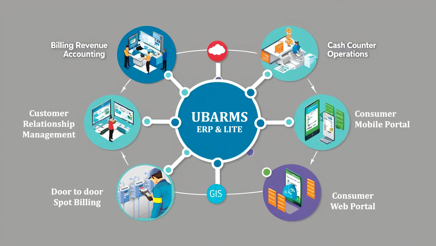 UBARMS Integrated end to end custom ERP solutions offers Customer Information, Billing Accounting Revenue Management, Meter Data Management(MDM) , CRM, and Online Cash counter Solutions, Web portal, Spot Billing (door to door Meter reading, automatic & remote meter reading- billing & collection) MIS – Reports, Alerts, Dashboards and it’s integrated with SCADA, GIS and MM (Mainitance Management System).
